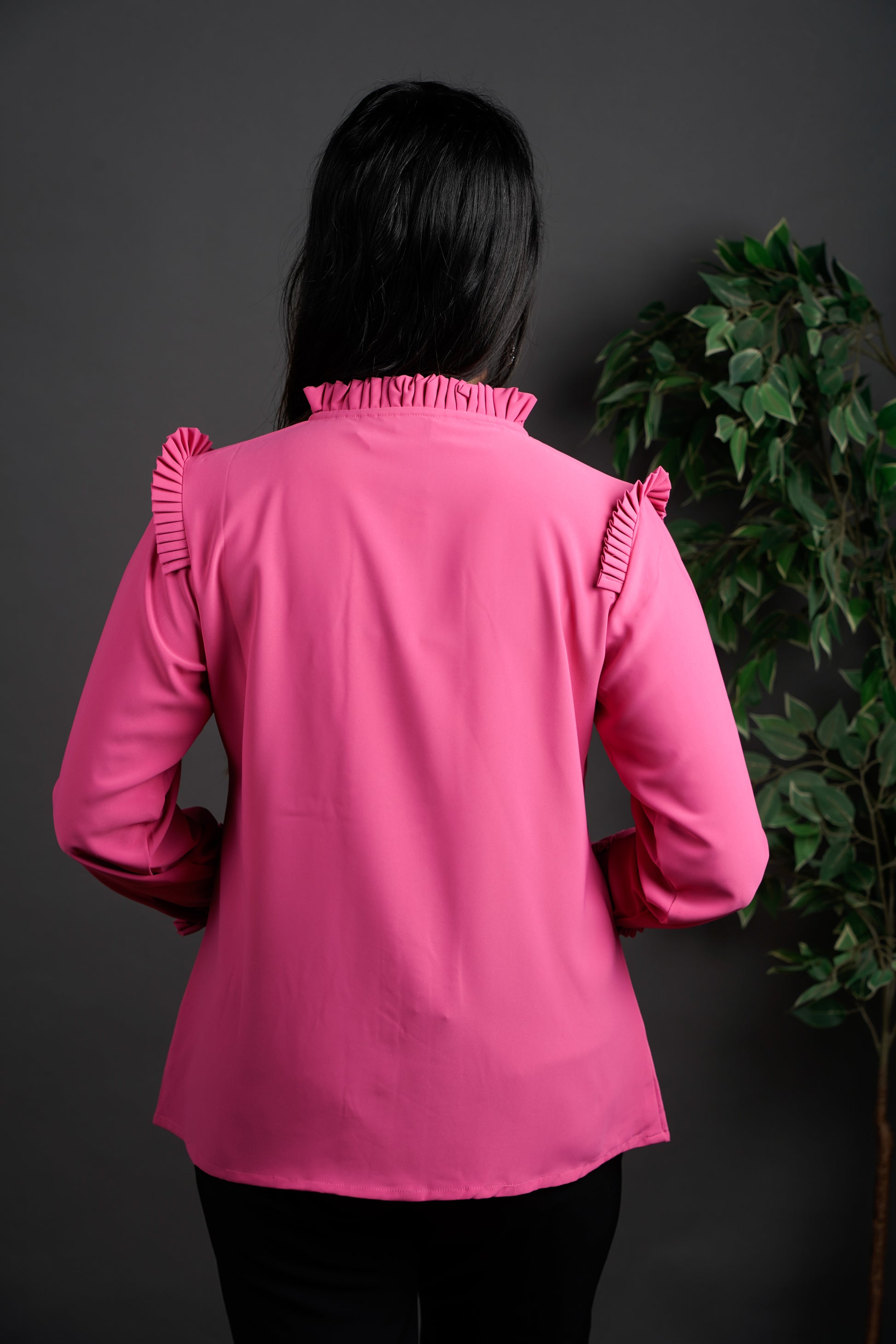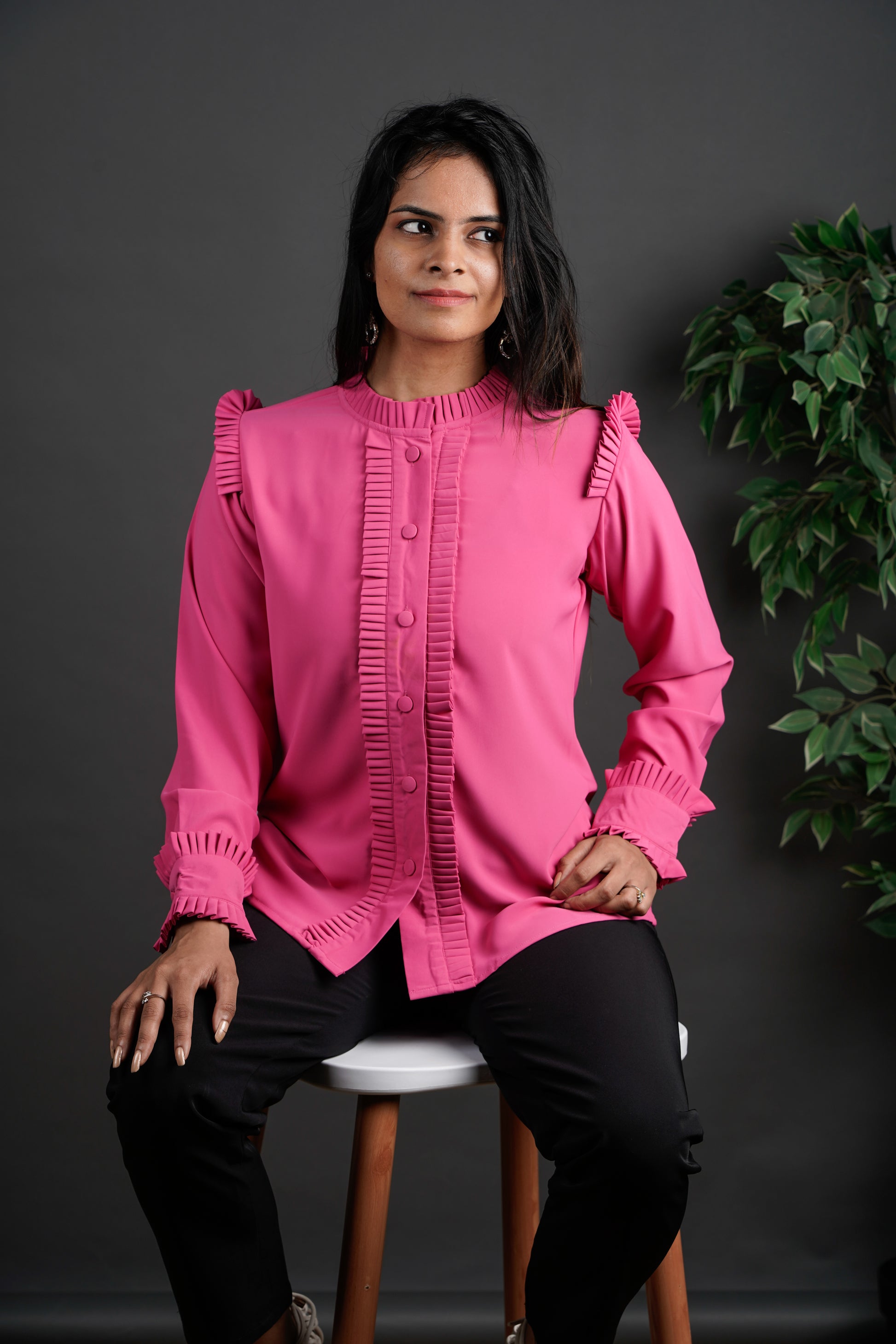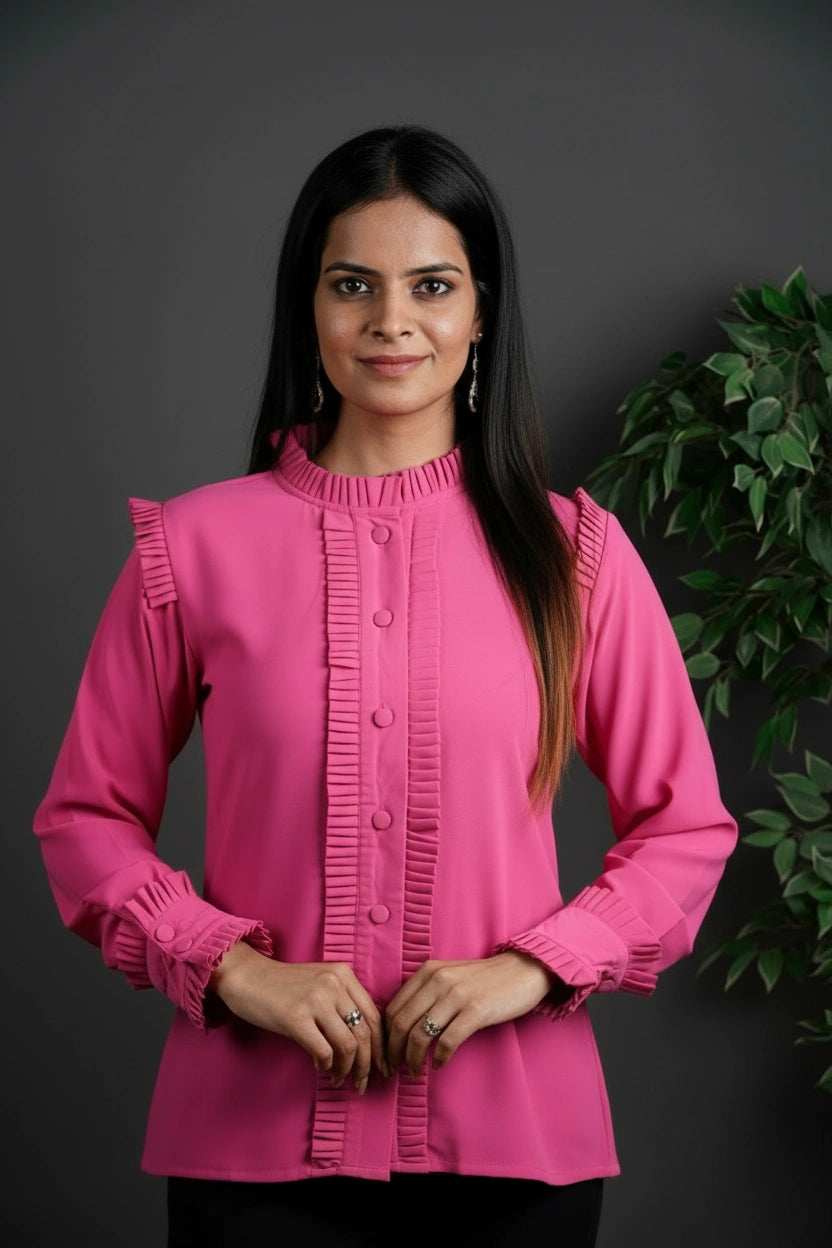 This shirt is all about presence. With intricate pleated frills framing the shoulders, buttons, and cuffs, it brings a tailored drama that means business. It's not over-the-top — it’s just enough to say you’ve thought about the details, and they matter. Designed for women who mix strength with style and don’t shy away from standing out.