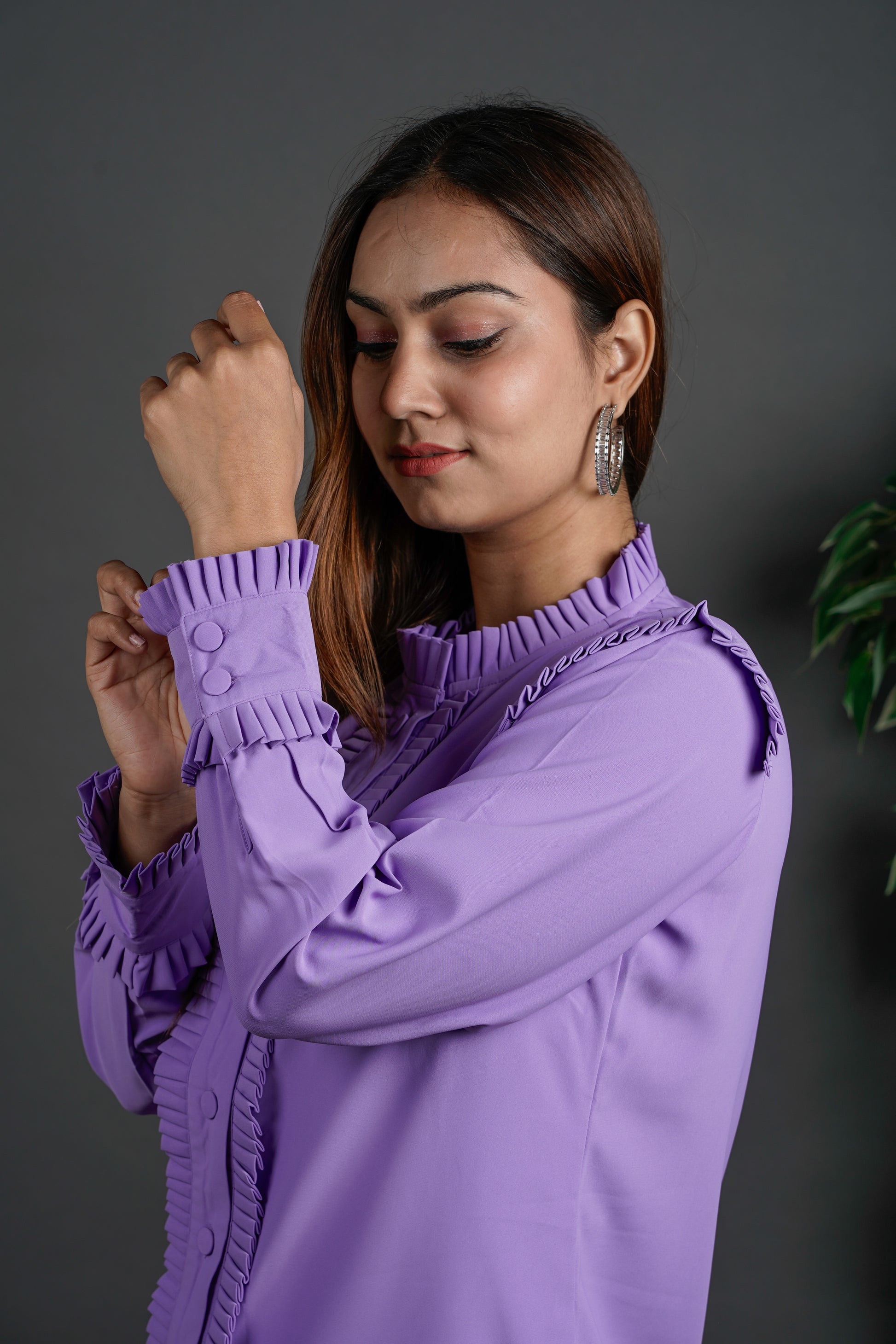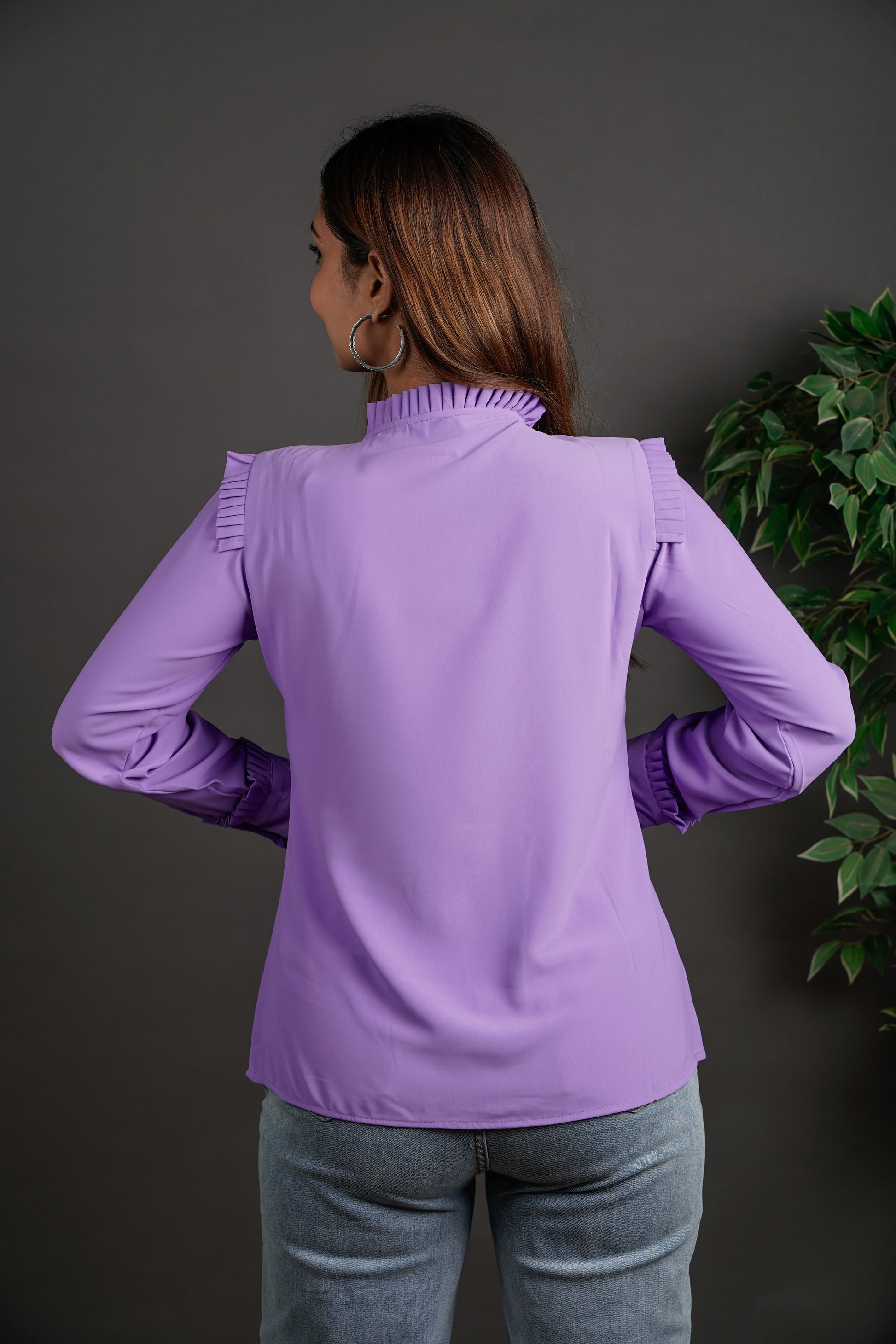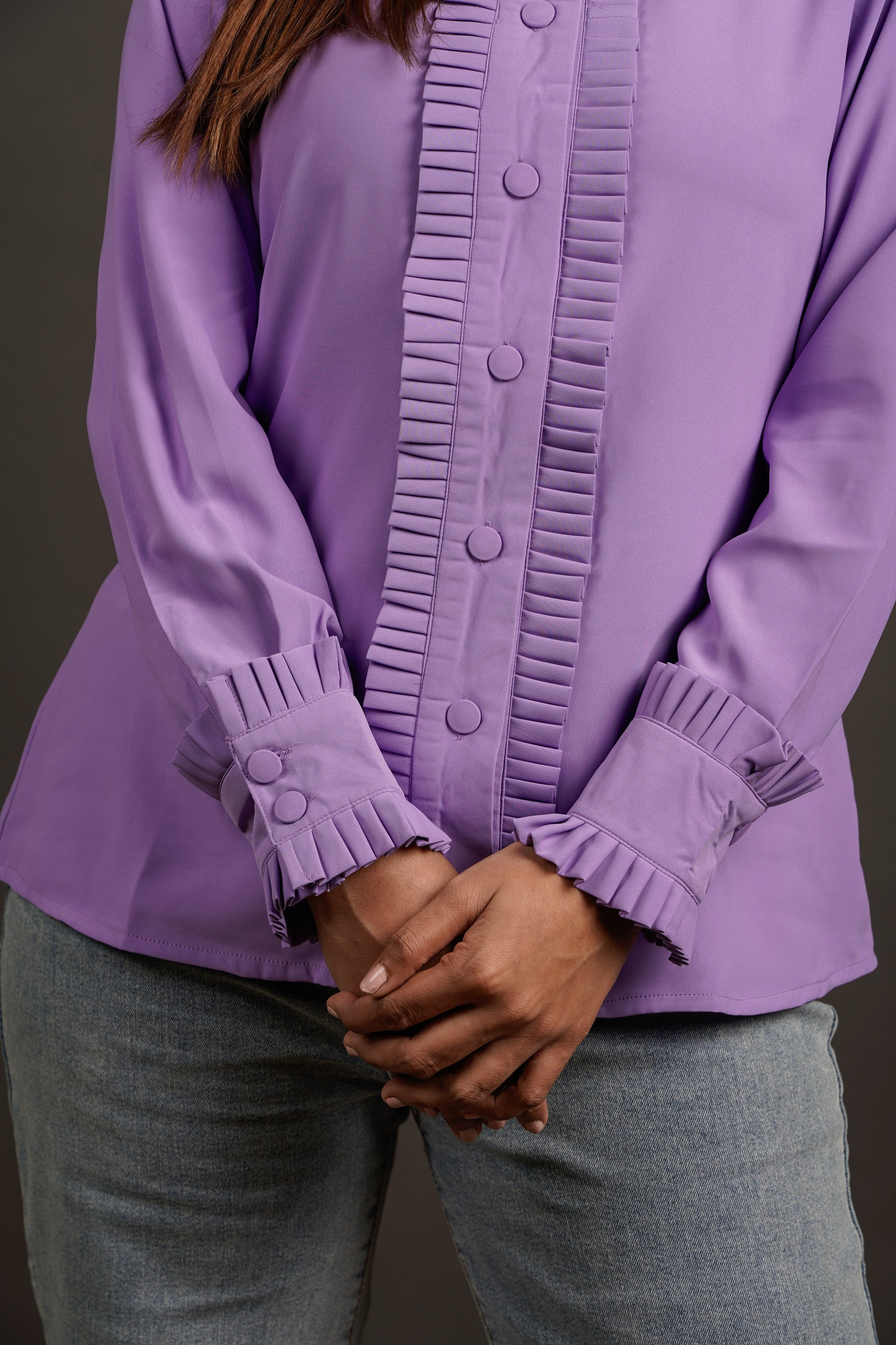 This shirt is all about presence. With intricate pleated frills framing the shoulders, buttons, and cuffs, it brings a tailored drama that means business. It's not over-the-top — it’s just enough to say you’ve thought about the details, and they matter. Designed for women who mix strength with style and don’t shy away from standing out.