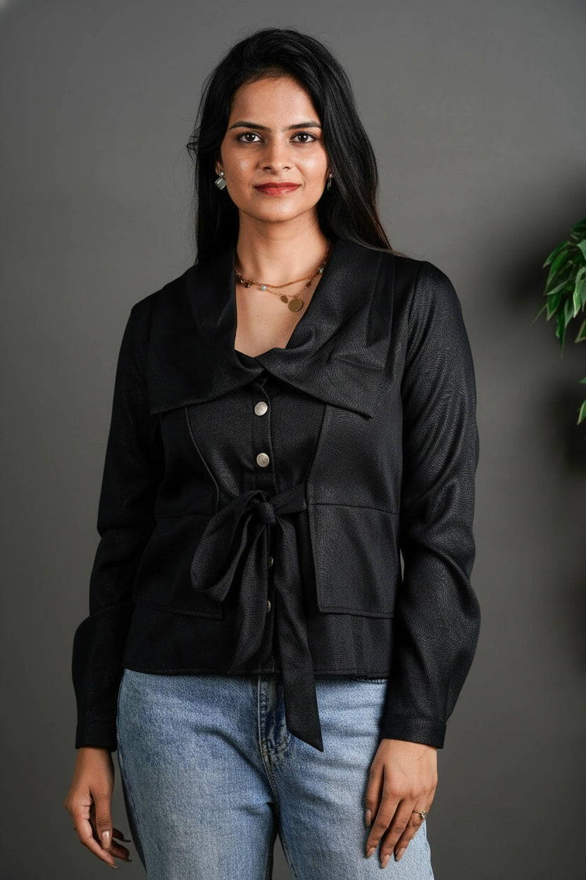 This top is all about refined structure — with a soft draped neckline, deep bold hues, and a subtle blazer-inspired overlay that brings instant sophistication. The matching fabric belt cinches the waist just enough, giving form without restriction. Designed for evenings that call for confidence, and styling that speaks before you do.