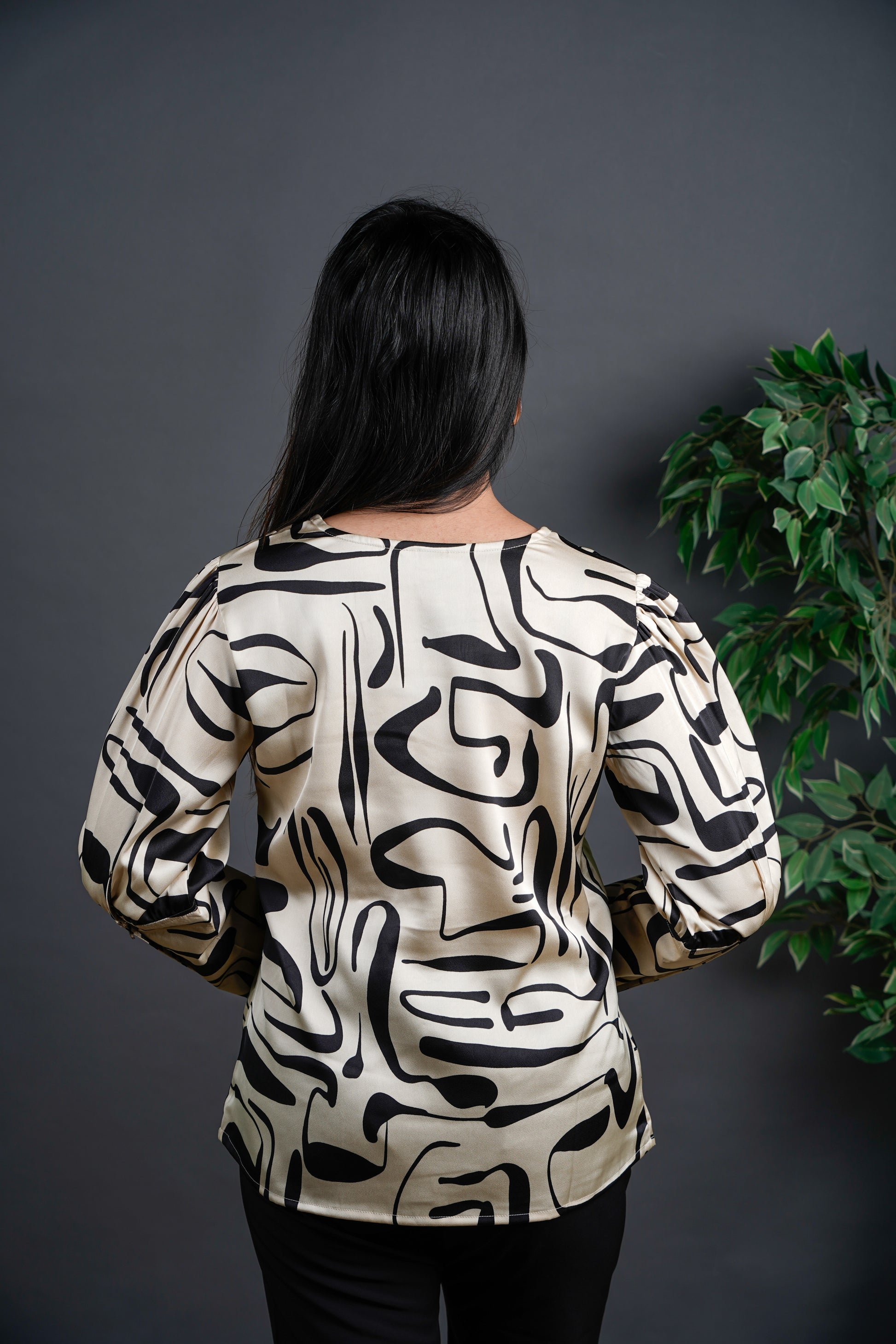This top is where creativity meets control. The playful all-over print keeps things light, while the full sleeves and bold cuff detailing bring structure and polish. Whether you’re leading a brainstorm or breezing into a client lunch, this one’s built to keep up — and stand out.