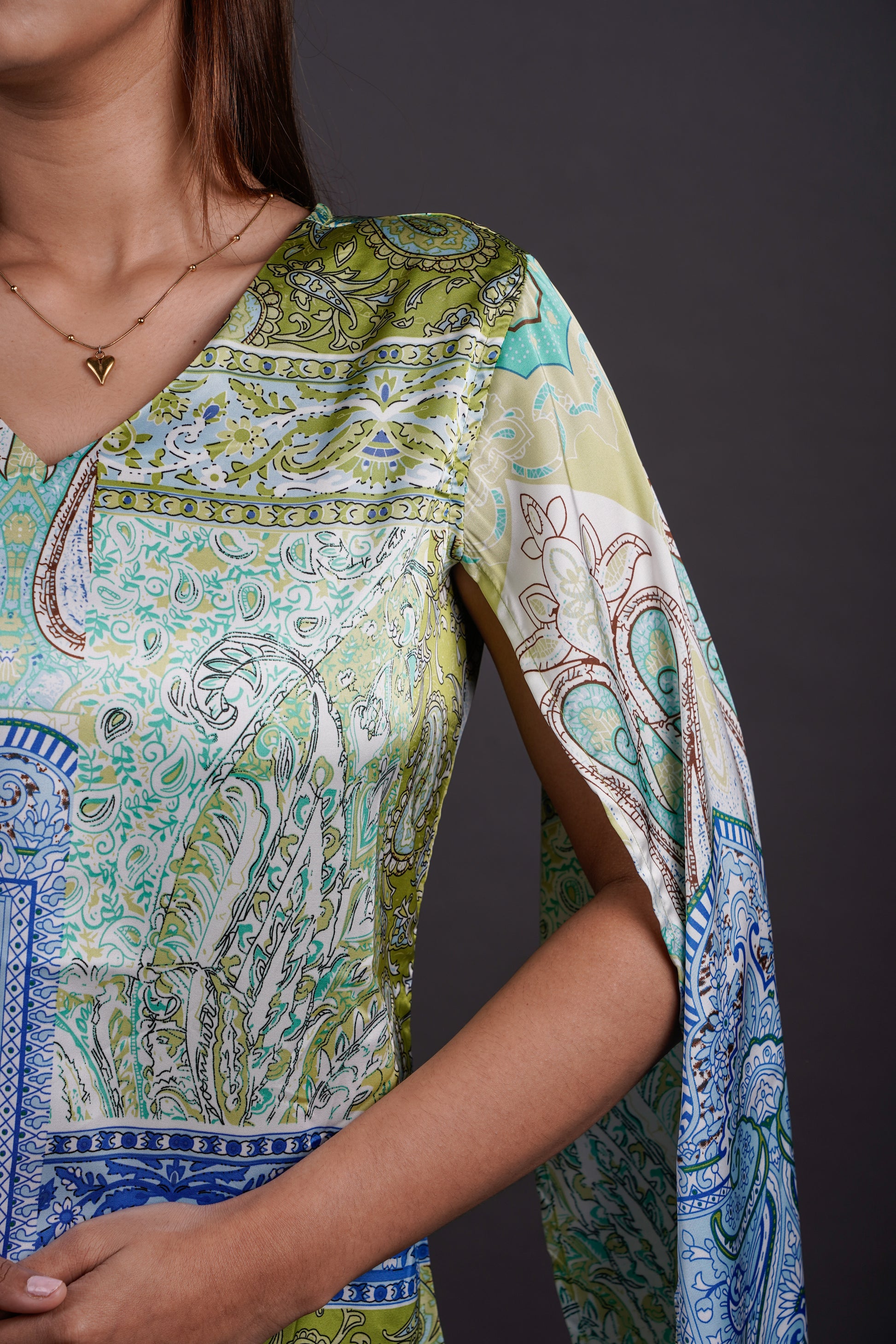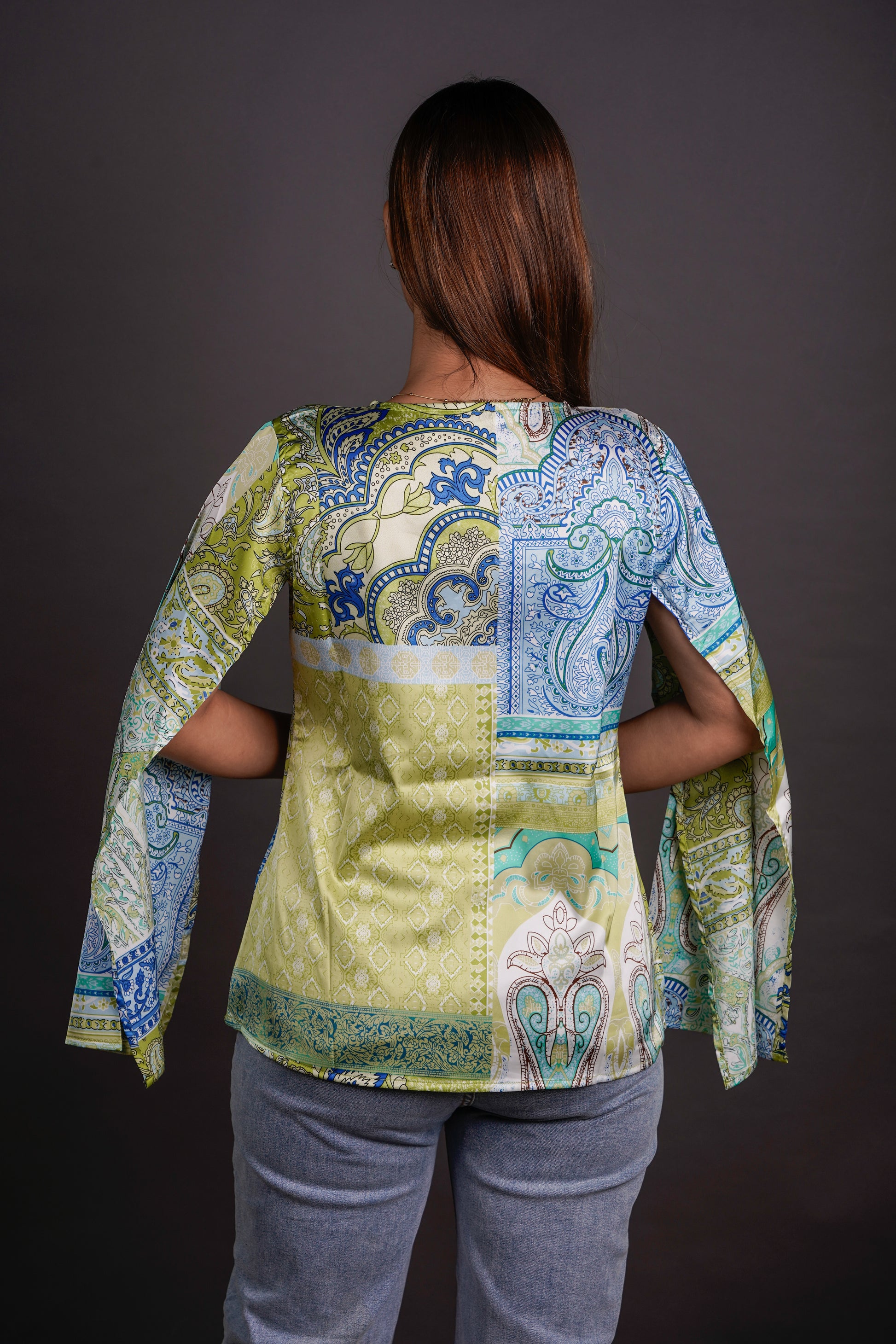 This top is all about movement — from the fluid sleeves to the easy A-line cut. The bold, imported print does the talking, while the V-neck and draped sleeve detail keep it effortlessly put-together. It’s the kind of piece that feels like a statement but wears like a staple — throw it on, and you’re out the door.