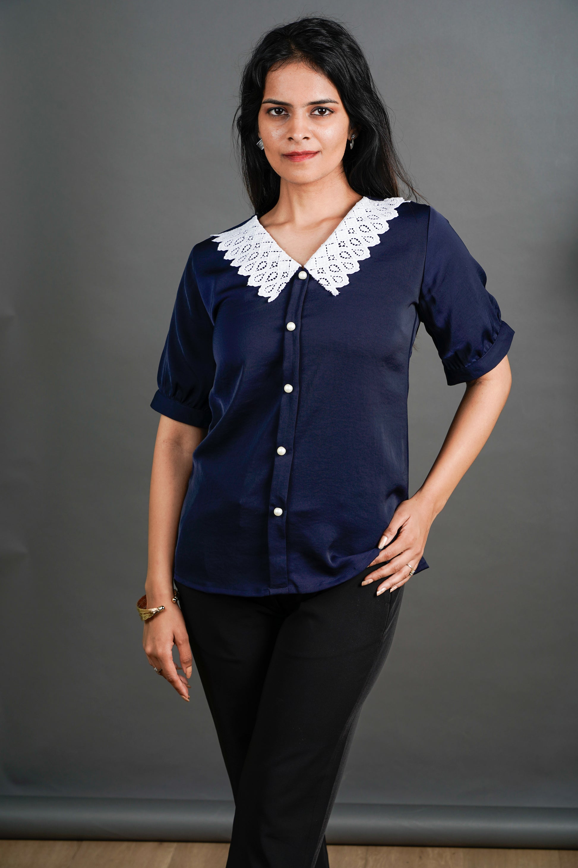 This top adds just the right amount of charm to your weekday rotation. The wide lace collar feels nostalgic but looks sharp, giving structure to a soft silhouette. Whether you’re dialling in from your desk or presenting in person, it brings a little unexpected delight to your 9-to-5.