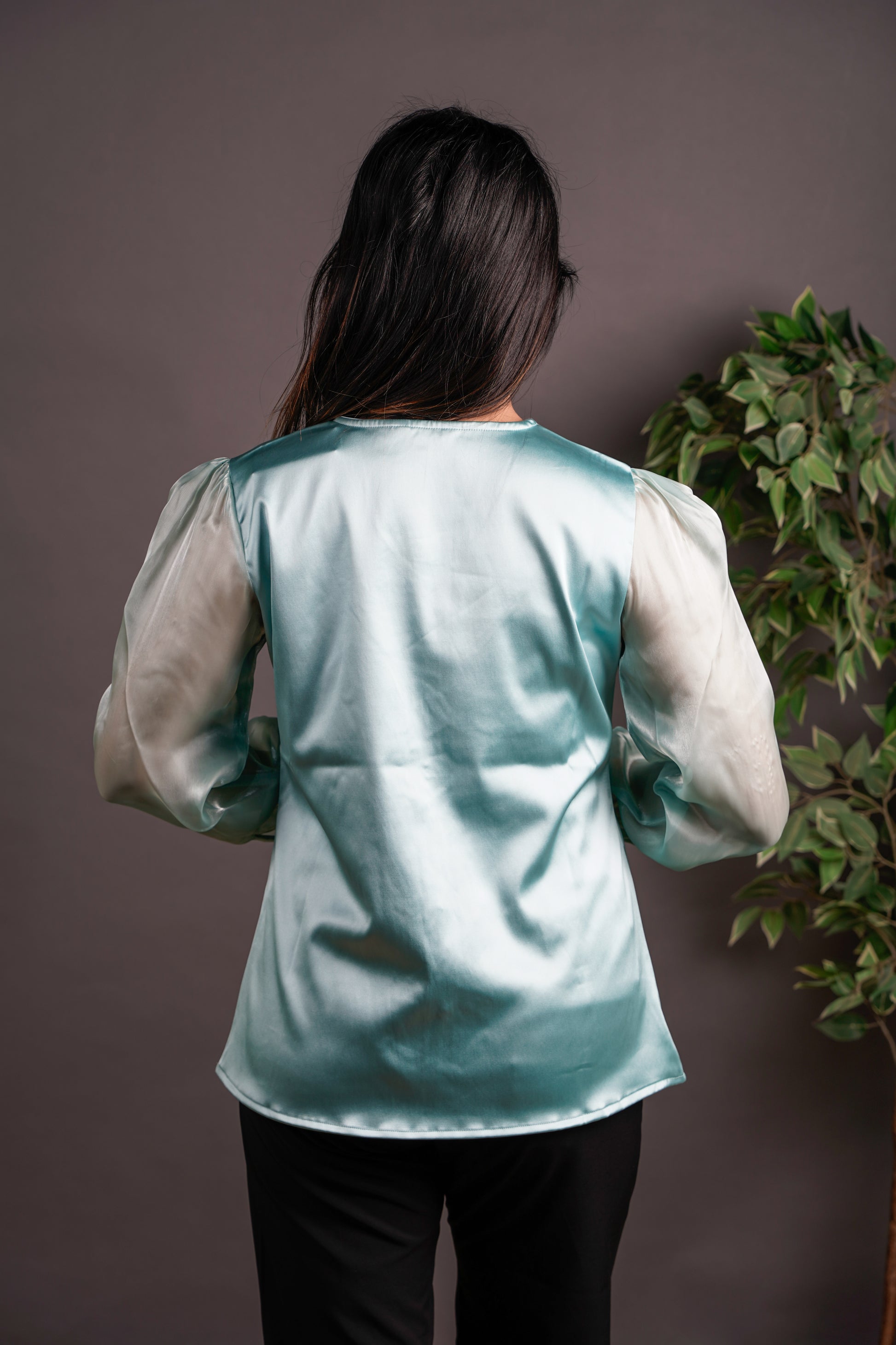 This blouse balances polish with femininity — a crisp satin body contrasted with sheer organza sleeves that speak softly but stand tall. The subtle shoulder puff adds structure and gives a hint of playfulness. It’s for the woman who moves with intention — and turns heads without trying.