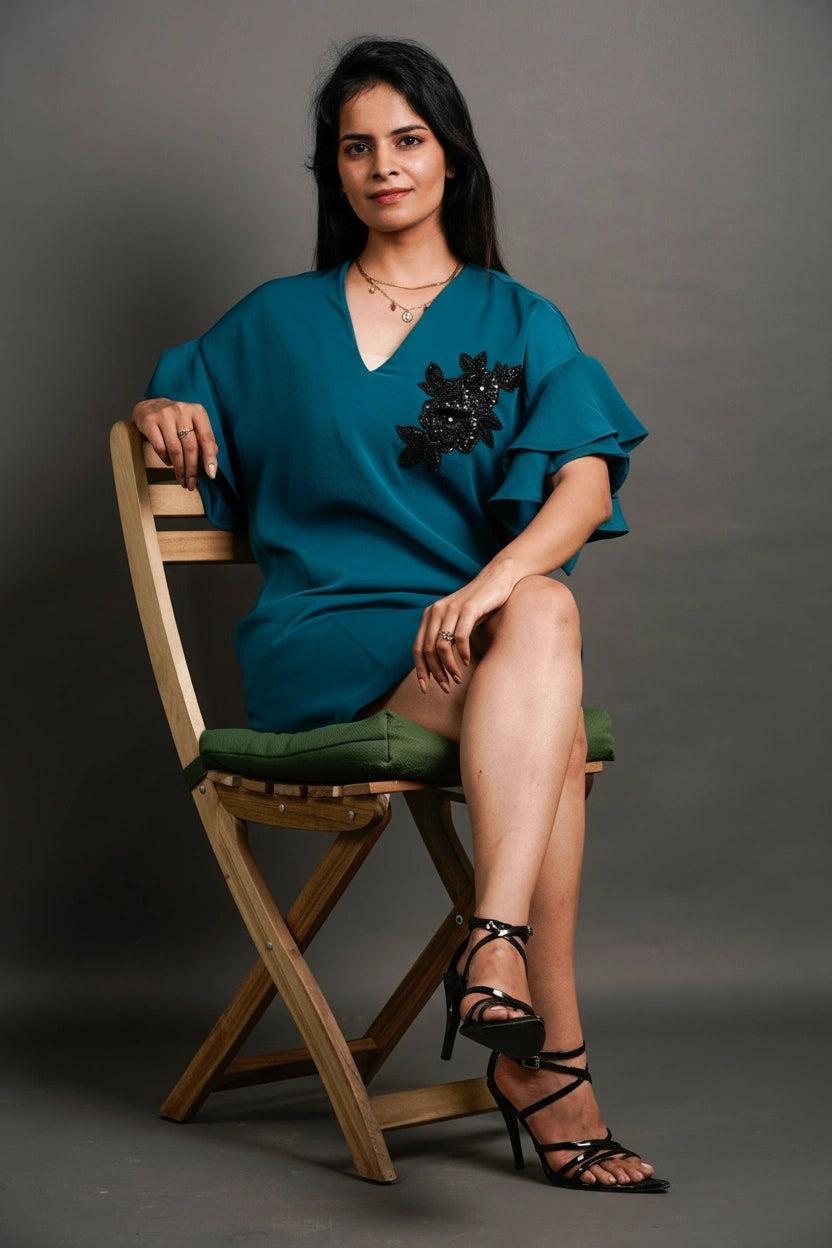This georgette dress brings together structure and femininity — with a fluid drape that moves with you and bold patch accents (customizable to your flair). Designed for long days that roll into longer evenings, it’s an easy upgrade from your usual shift dress — light, breathable, and full of quiet confidence.